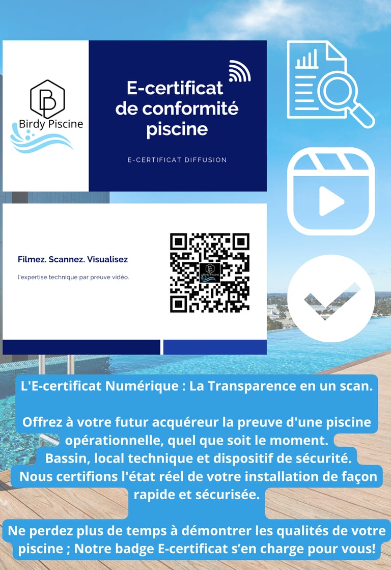 Agences : Intégrez une preuve de transparence absolue à vos clients. Ce Badge numérique permet un scan immédiat qui suffit à rassurer un acquéreur potentiel sur la viabilité technique du bassin.